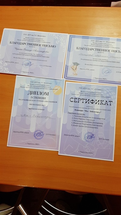 5 ноября на базе ПГУ им. Т.Г. Шевченко прошёл республиканский турнир по математике ФИЗМАТКВИЗ. В турнире принимали участие 11 команд. Наши учащиеся 10-11-х классов стали лучшими среди сверстников республики и заняли первое место. Такие мероприятия доказывают важность математического образования, свидетельствуют о том, что уроки математики и физики в школе проходят на высоком уровне. Благодарим педагогов - наставников!